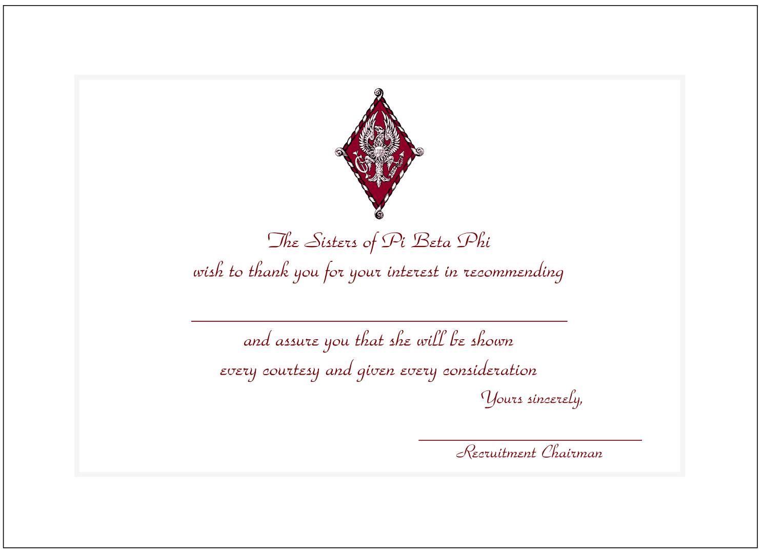 Impress alumni and set your chapter apart from the others. Show Nationals that you take recruitment seriously. These full color flat panel cards are the professional way to formally thank those who have sent you new member recommendations. Printed in vibrant inks on thick vellum stock. Envelopes included.